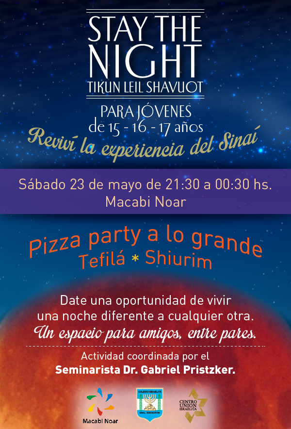 El sábado 23 de mayo se viene una gran velada para todos los jóvenes de 15 a 17 años: «Stay the Night, Tinkun Leil Shavuot». Te invitamos a que vengas a nuestra institución a partir de las 21:30 hs. hasta las 00:30 hs. para pasar una noche diferente, con amigos, para que revivas la experiencia del Sinaí.